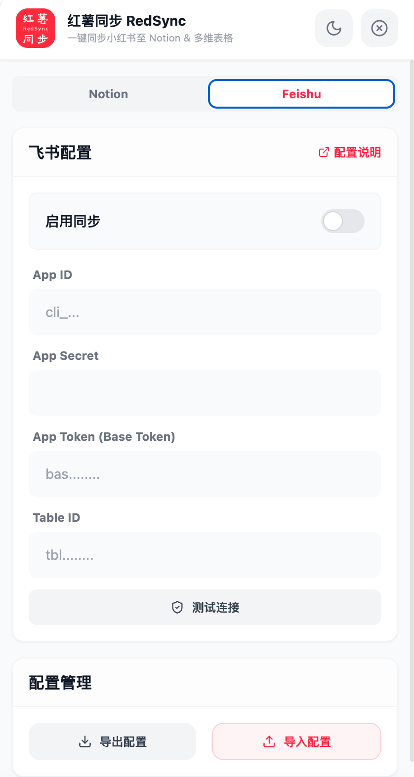 打开 RedSync 插件 -> 设置 -> 飞书配置。